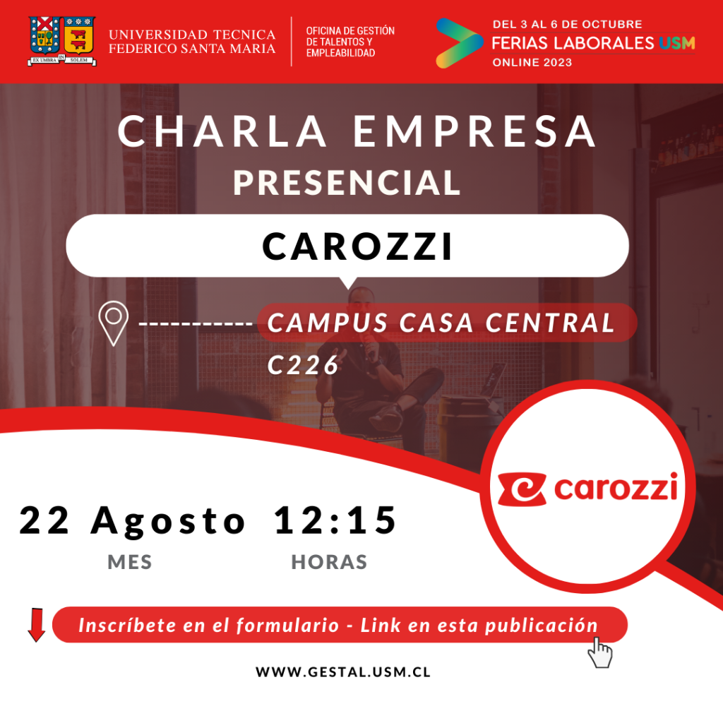 🤩 ¡Talentos! Los invitamos a participar de la charla PRESENCIAL que nos trae Carozzi para las Ferias Laborales USM 2023!