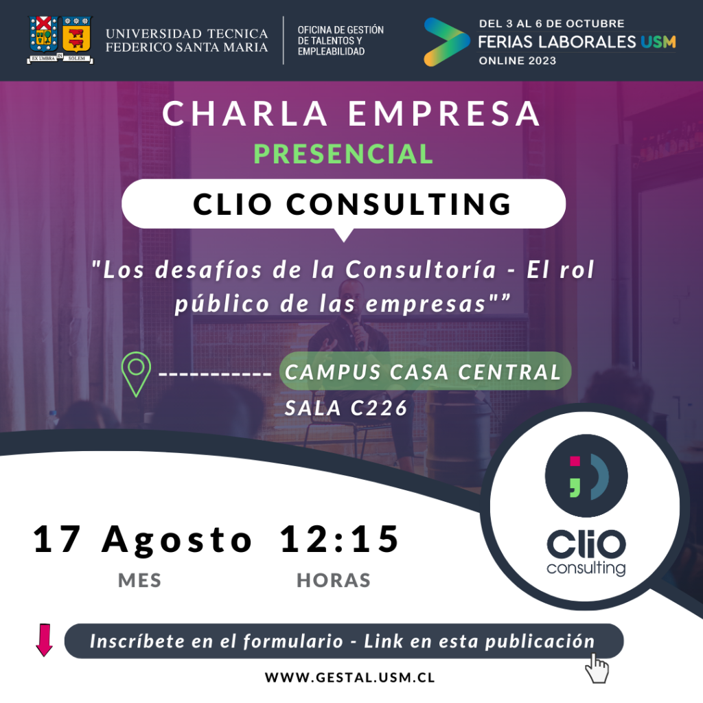 🤩 ¡Talentos! Los invitamos a participar de la charla PRESNECIAL que nos trae Clio Consulting para las Ferias Laborales USM 2023!