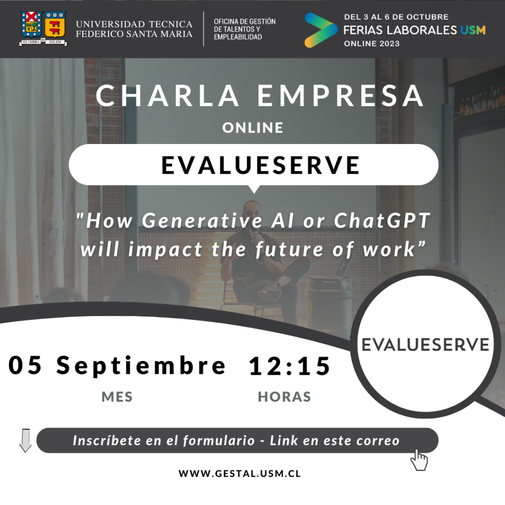 La Universidad Técnica Federico Santa María, a través de la Dirección General de Vinculación con el Medio y su Oficina de Gestión del Talento, Gestal, los invita cordialmente a participar de la charla "How Generative AI or ChatGPT will impact the future of work", que será dictada por la empresa Evalueserve, en el marco de las Ferias Laborales USM 2023.