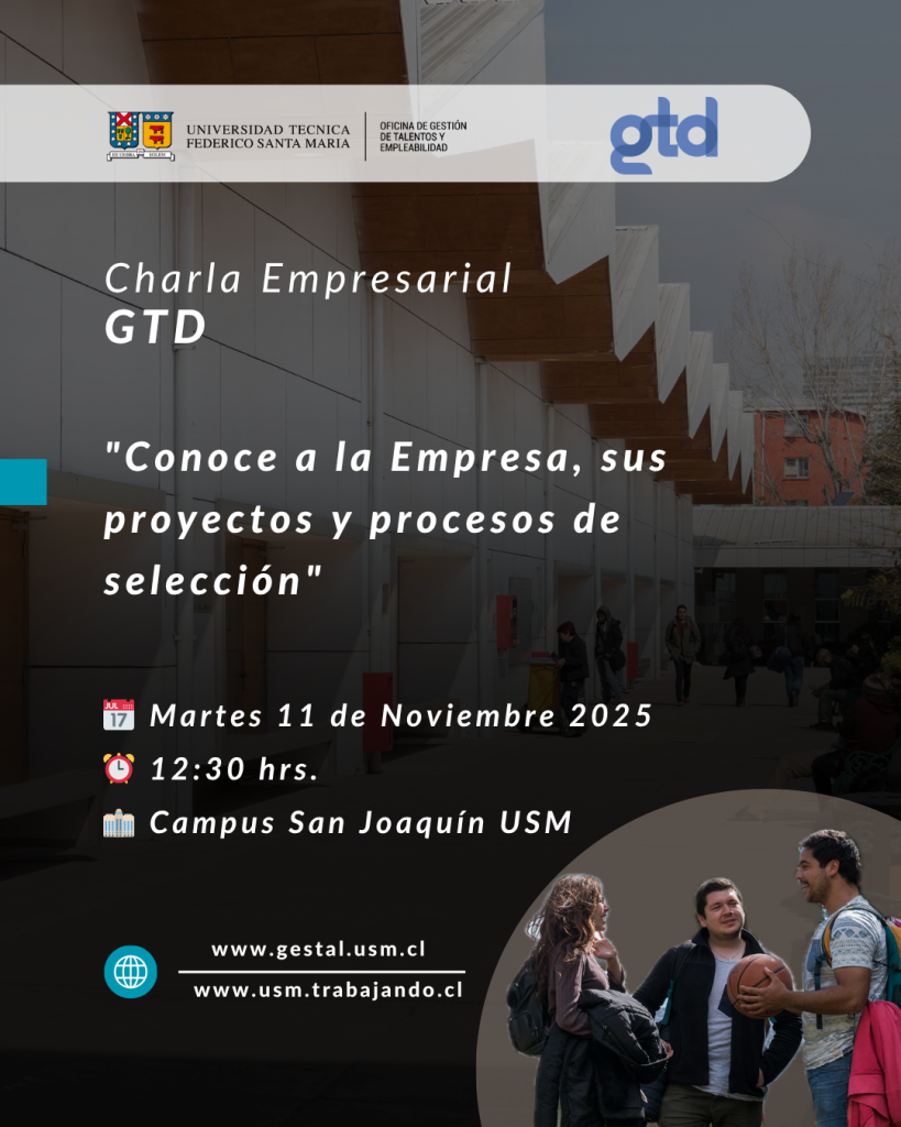 ¡Los invitamos a participar de la Charla GTD I "Conoce a la Empresa, sus proyectos y procesos de selección" que la empresa trae para ti! 💼