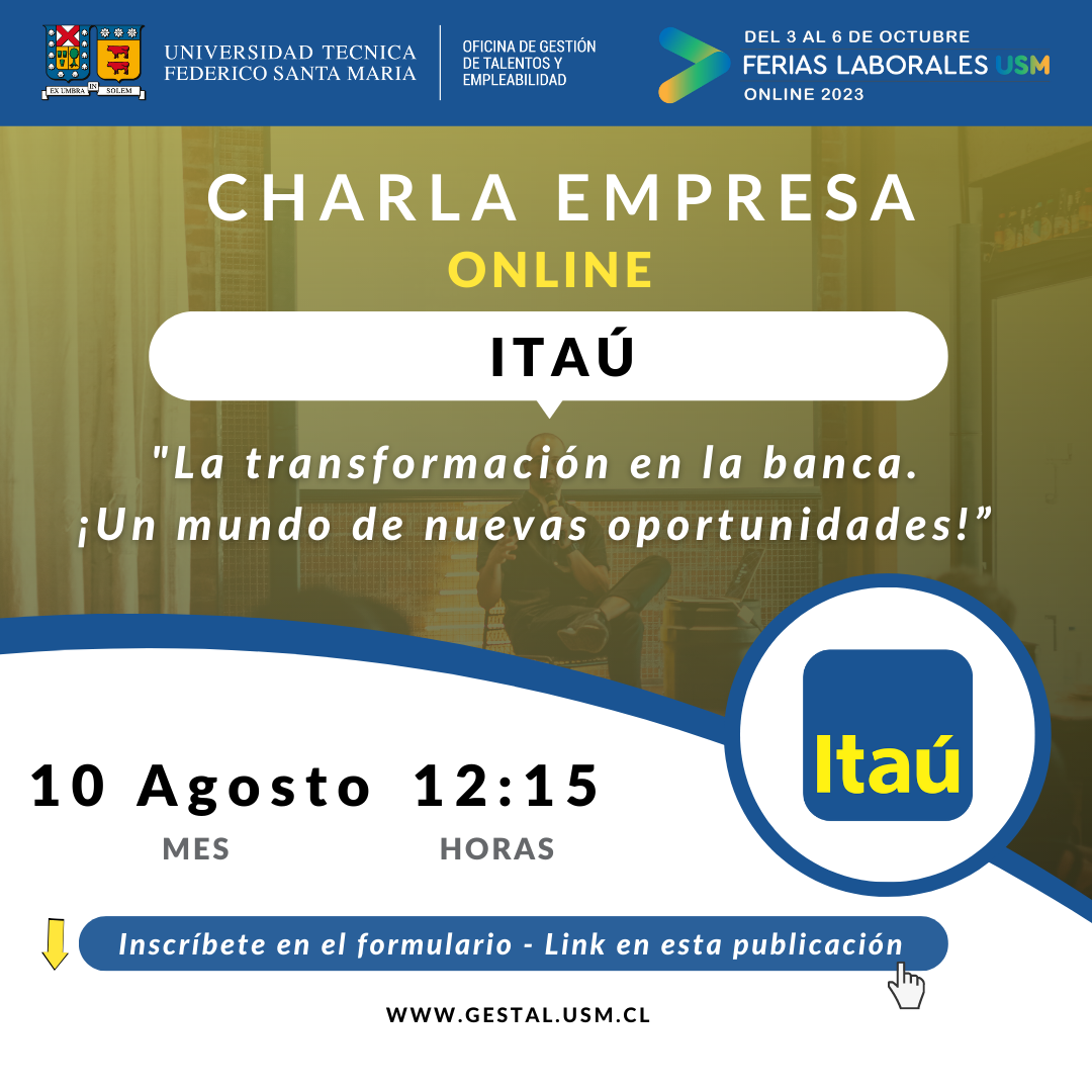 🤩 ¡Talentos! Los invitamos a participar de la charla que nos trae ITAÚ para las Ferias Laborales USM 2023!