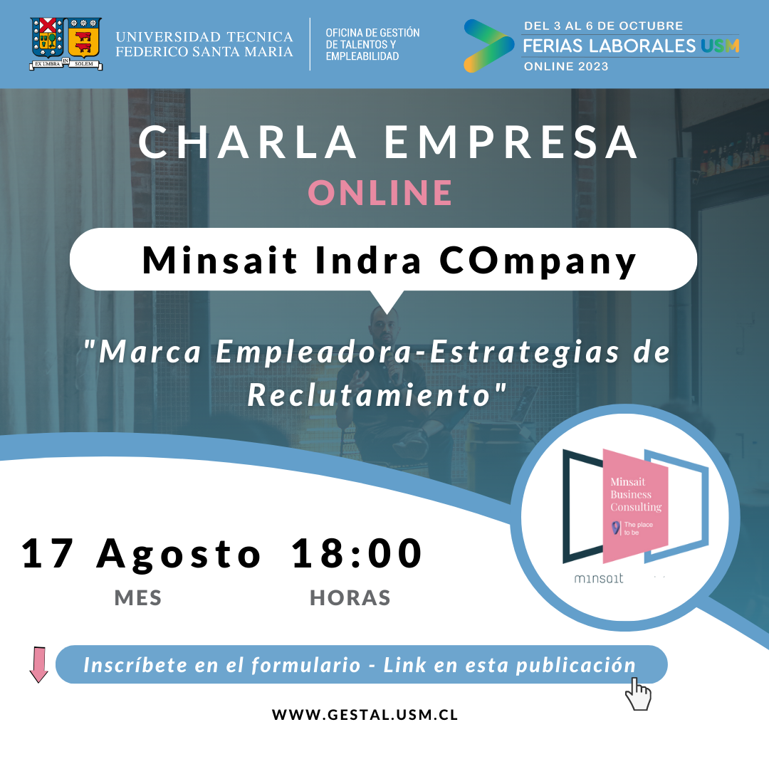 🤩 ¡Talentos! Los invitamos a participar de la charla que nos trae Minsait Indra COmpany para las Ferias Laborales USM 2023!