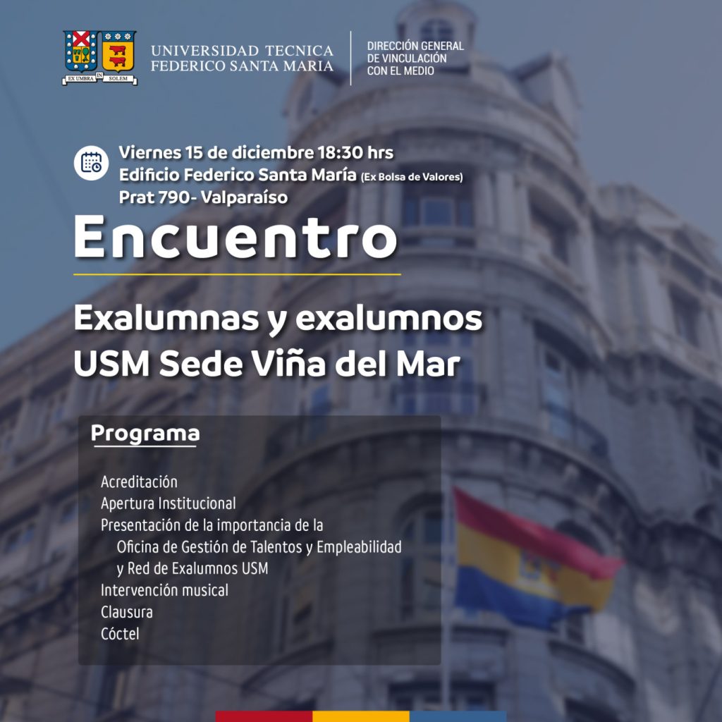 Te invitamos a reencontrarte con tu alma mater y a reunirte con tus excompañeros de la Sede Viña del Mar. Anímate y vive una gran experiencia. ¡Esperamos contar con la presencia de tod@s para hacer de este encuentro un momento inolvidable y despedir este 2023! 📲Inscríbete aquí: https://forms.gle/fxGYHndbF67GQUNv9 💥100 cupos disponibles asegurados con pago de Inscripción de 5 mil pesos a la siguiente cuenta Banco de Chile Cuenta Corriente: 671407928 Rut: 81668700-4 Universidad Técnica Federico Santa María Exalumnos@usm.cl 👉🏻Dudas: exalumnos@usm.cl