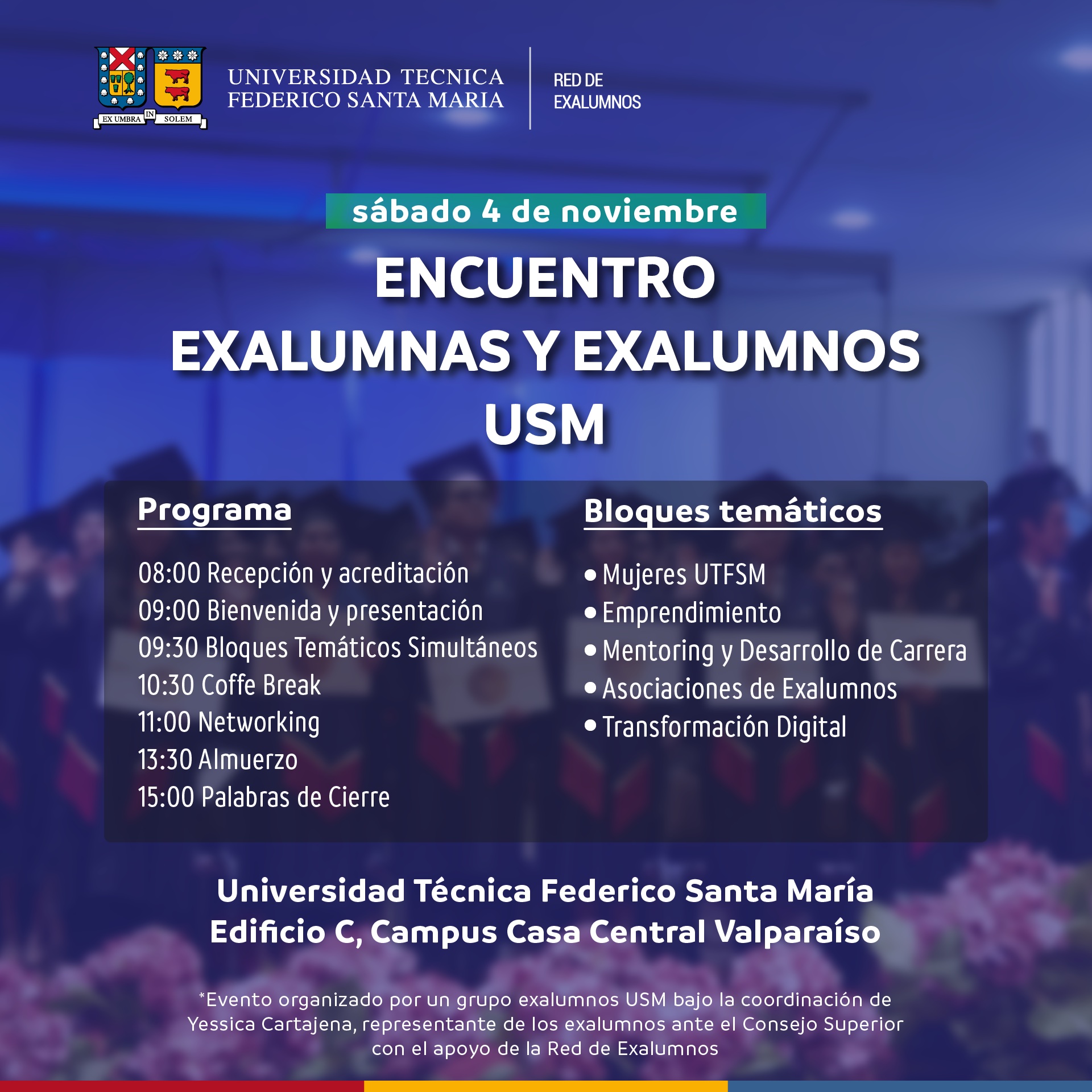 -09:00 - 09:30: Bienvenida y presentación del encuentro Yessica Cartajena,Representante Consejo Superior Ex Alumnos / Palabras de Bienvenida Rector Juan Yuz / Descripción del Encuentro Begoña Pávez, Daniela Jaraquemada