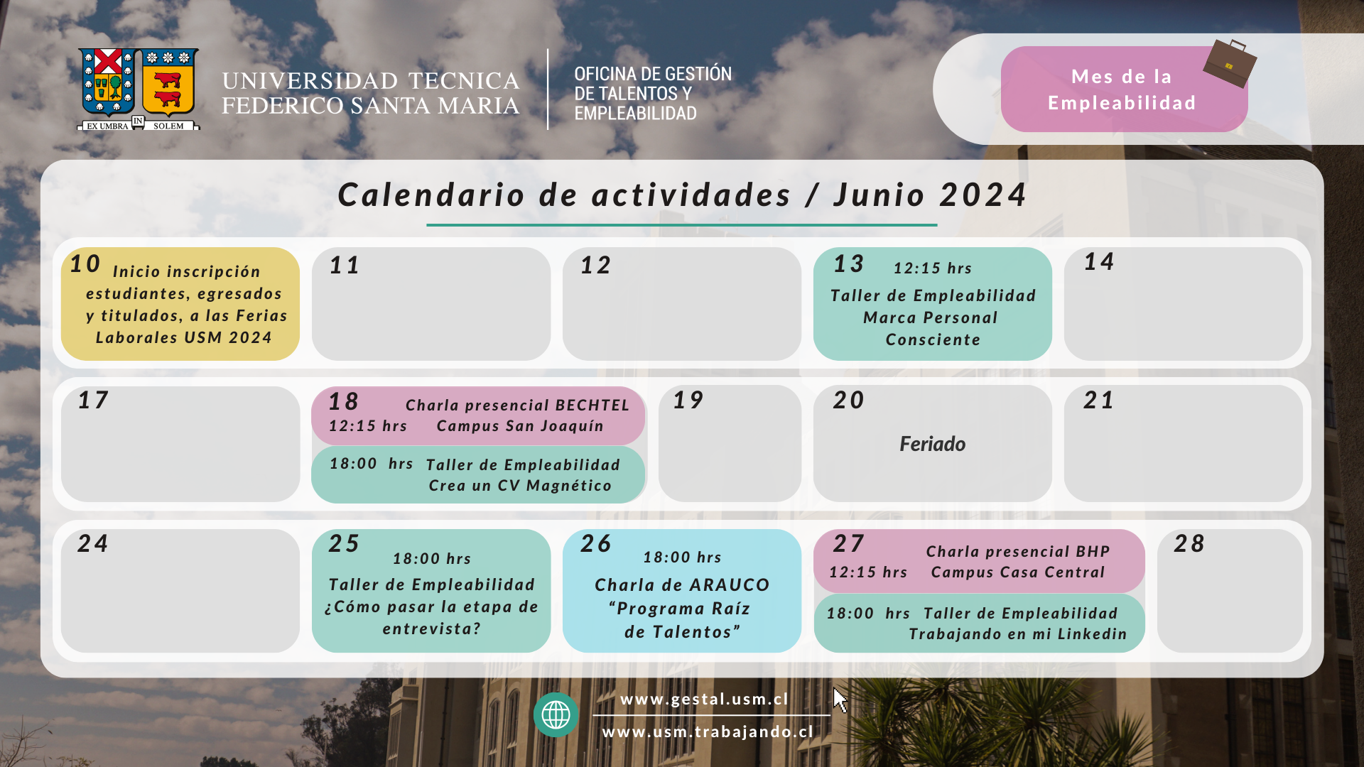 Junio es el Mes de la ✨Empleabilidad✨ y Gestal se complace en invitarlos a las Ferias Laborales USM 2024, así como a una serie de talleres y charlas.