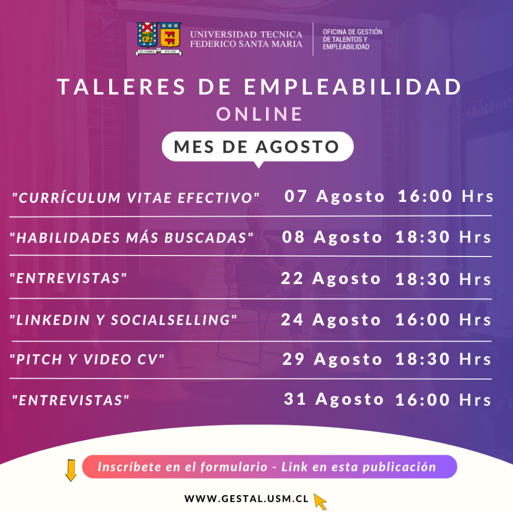 Durante el mes de Agosto podrás inscribirte a las siguientes charlas: