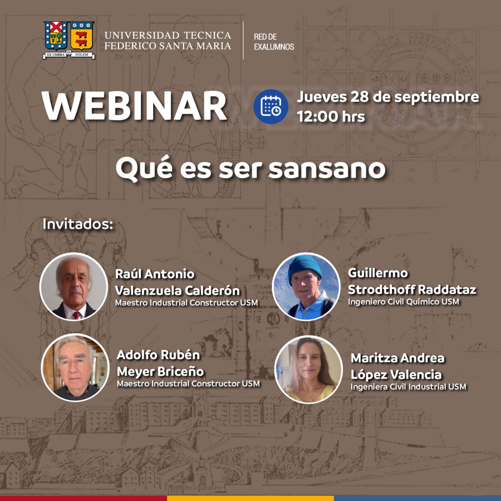 La Red de Exalumnos USM en conjunto con AEXA STGO USM, te invitan a participar de un dinámico webinar acerca de las implicancias de ser parte de la comunidad sansana. En esta oportunidad nos acompañarán cuatro exalumnos quienes comentarán qué es ser sansano: un estilo de vida, ser parte de una comunidad, un legado y una historia que está bajo el alero de la Universidad Técnica Federico Santa María. Ser sansano es descubrir "desde la sombra a la Luz" la ciencias y tecnologías.