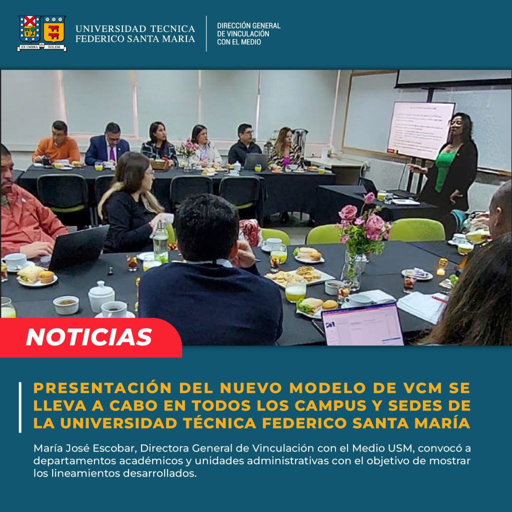 Con el objetivo de dar a conocer la actualización del modelo de gestión de vinculación con el medio, María José Escobar, Directora General de Vinculación con el Medio, convocó a las unidades académicas y docentes de los diversos Campus y Sedes que compone la Universidad Técnica Federico Santa María. En el encuentro se visualizaron los lineamientos desarrollados en concordancia con las políticas elaboradas por la Comisión Nacional de Acreditación y por la Misión Visión establecida por la Casa de Estudios donde se focalizó en los desafíos autoimpuestos por nuestra comunidad y la tarea que debe cumplir dicha dirección.