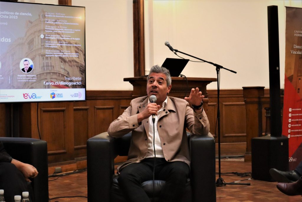 El encuentro respaldado por el Instituto de Sistemas Complejos de Valparaíso y el Ecosistema de Emprendimiento e Innovación de Valparaíso, EIVA, contó con la participación de la jefa de la División de Fomento e Industria del Gobierno Regional de Valparaíso, Camila Bolados, la directora ejecutiva del Consejo Nacional CTCI para el Desarrollo, Katherine Villarroel y el director regional de Corfo Valparaíso, Etienne Choupay,, y fue moderado por el director de Innovación de la UV, Alejandro Dinamarca, quienes sostuvieron una conversación en torno a los desafíos de la región frente a los procesos de innovación del mercado regional a la par del establecimiento de un crecimiento sostenible y cuidadoso con el medioambiente.