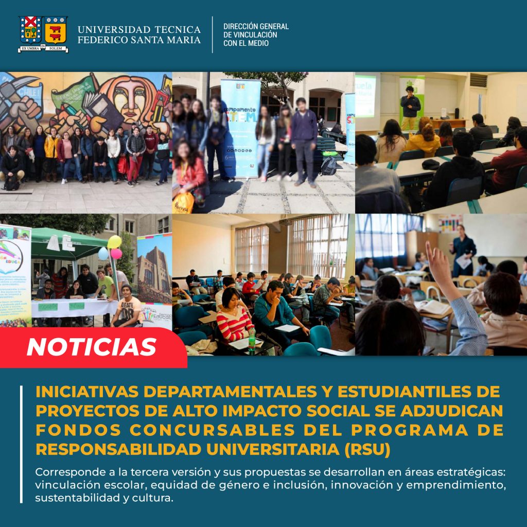 En el marco del proyecto del Ministerio de Educación (MINEDUC) –FSM1995- “Diseño y ejecución de un modelo innovador de gestión de Programa Responsabilidad Social Universitaria (RSU)”, la Dirección General de Vinculación con el Medio de la Universidad Técnica Federico Santa María, llamó a sus departamentos y estudiantes a participar de iniciativas con el fin de promover a la comunidad y contribuir en el desarrollo de competencias sello de los alumnos, a través del diseño de proyectos con un alto impacto en la sociedad.