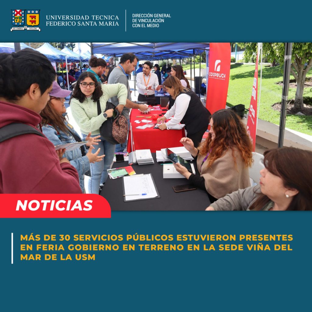 Con gran éxito se llevó a cabo la nueva versión de la Feria Gobierno en Terreno, actividad que ya es toda una tradición para la sede Viña del Mar de la Universidad Técnica Federico Santa María y que en esta oportunidad reunió a más de 30 instituciones públicas y una importante convocatoria de usuarios que pudieron realizar trámites y resolver dudas. Asimismo, estuvieron presentes instituciones no estatales ofreciendo sus prestaciones
