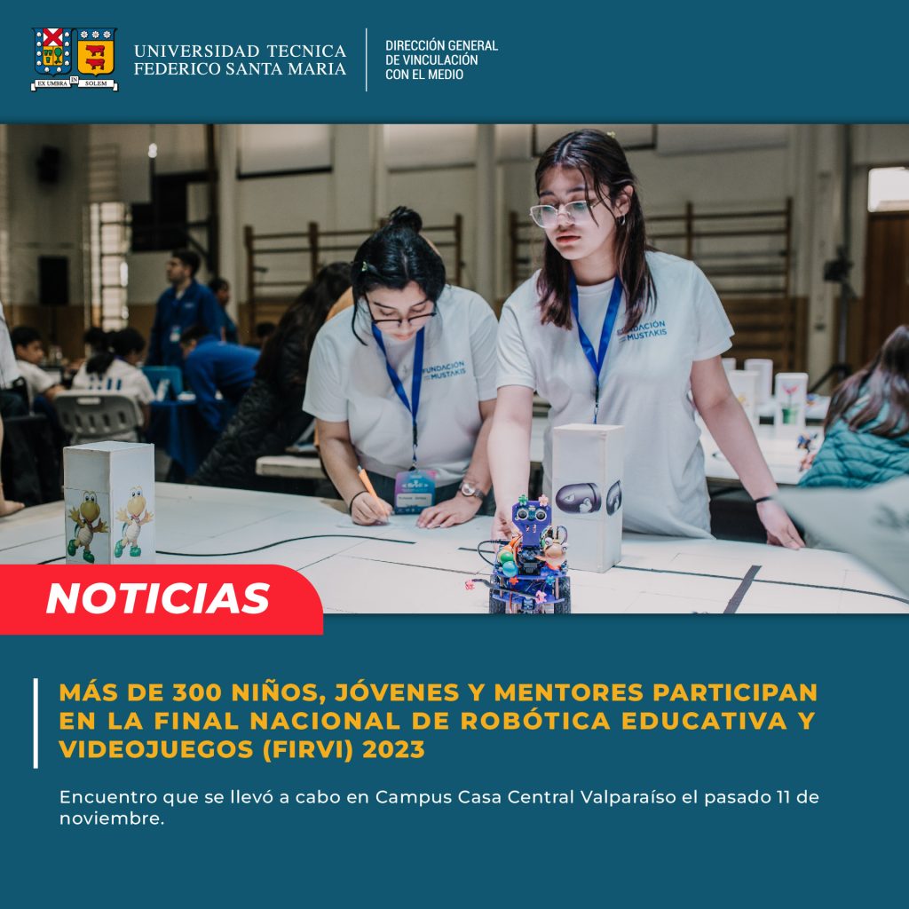 En el marco del cierre de las actividades presenciales del Programa de Ciencia y Tecnología de la Fundación Mustakis, el pasado 11 de noviembre más de 300 niños, jóvenes y mentores provenientes de diversas ciudades de Chile se reunieron en el Campus Casa Central Valparaíso de la Universidad Técnica Federico Santa María para participar de la Final Nacional de Robótica Educativa y Videojuegos (FIRVI) 2023.
